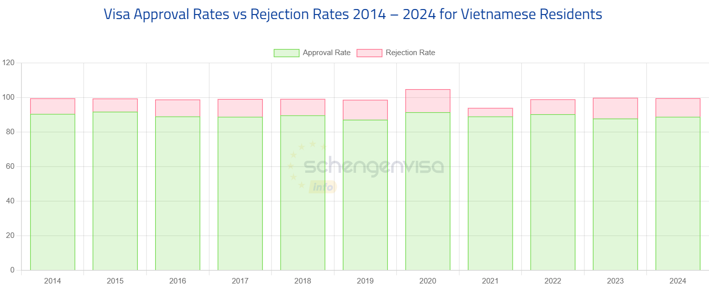 Các số liệu thống kê của châu Âu về tỷ lệ chấp thuận (approval) và từ chối (rejection) với người mang hộ chiếu Việt Nam nộp đơn xin visa Schengen, cho thấy bức tranh không như đồn thổi trên mạng xã hội.
