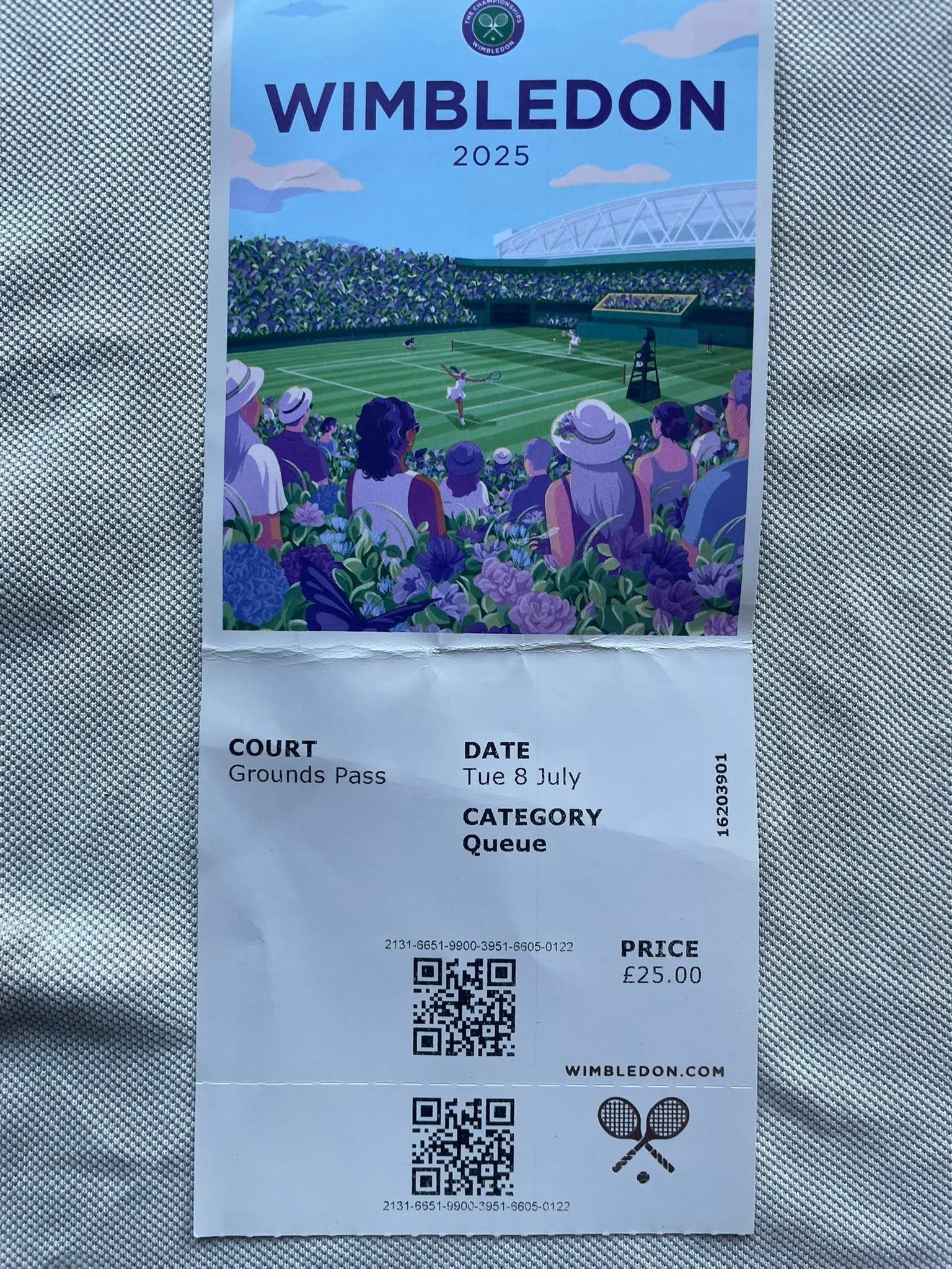 Đây là lần thứ ba tôi tới sân Wimbledon. Vào sân hôm 08/07/2025, tôi đã chụp ngay tấm hình biển tưởng niệm ngày nhà vua George V khai trương sân quần vợt mới, ở địa điểm hiện nay. Tấm biển được gắn vào tường cạnh cổng phía Nam của nhà thi đấu trung tâm Centre Court danh tiếng.