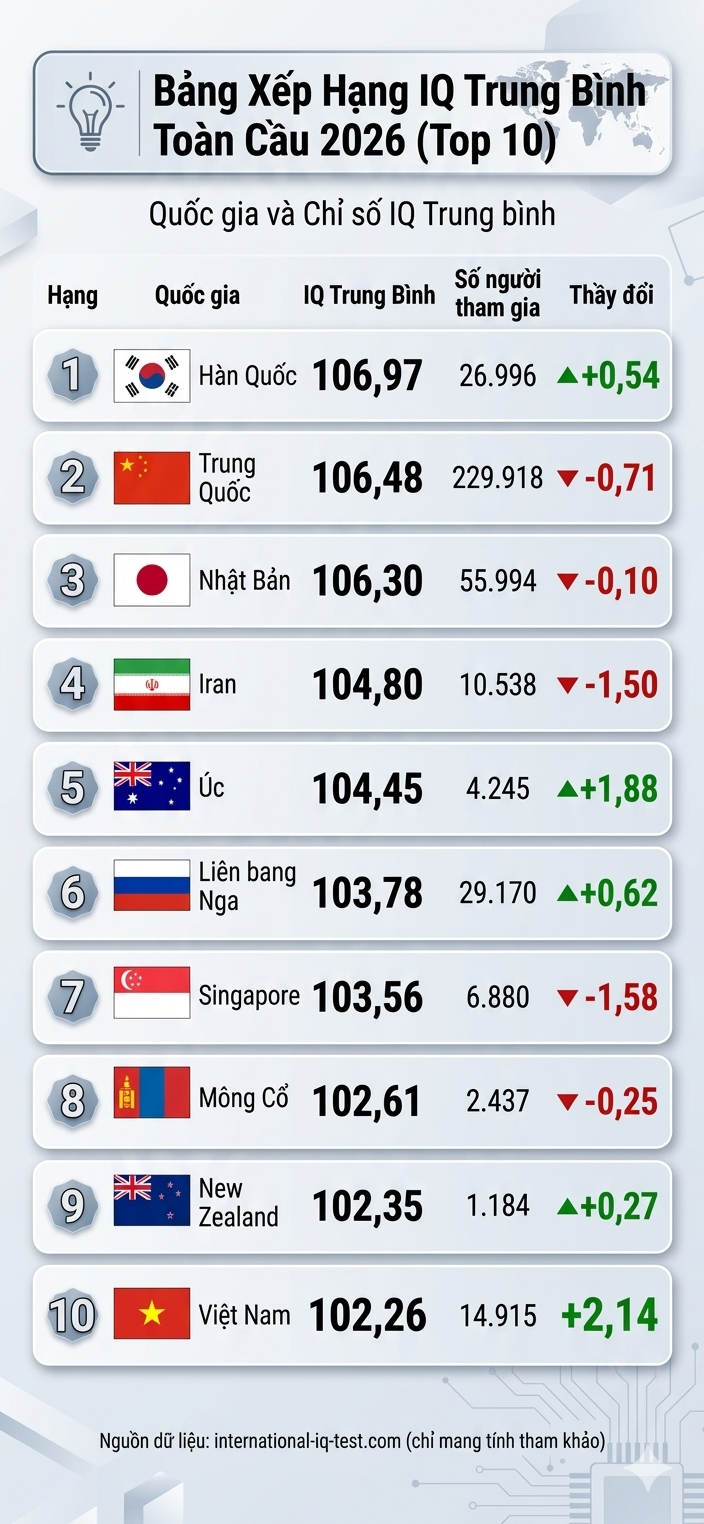 Việt Nam vào top 10 ‘các nước có chỉ số thông minh nhất thế giới 2026’
